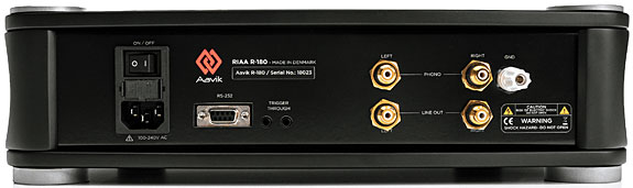 Like most phono preamplifiers, the Aavik R-180's rear panel is uncluttered. It has an IEC power cord input next to its on/off switch, an RS-232 input for firmware updates, two trigger switches to switch on the phono preamplifier when other components are connected to it.