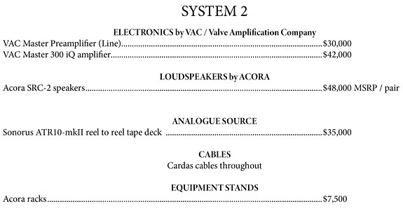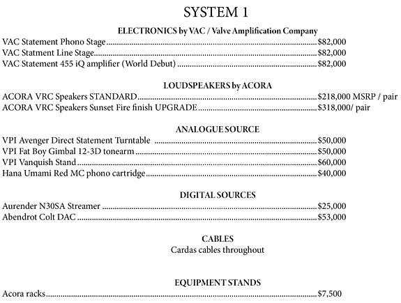 The one-two combination of VAC and Acora Acoustics is a match made in hi-fi heaven. Enjoy your fave tunes as the immersive soundscape seems to naturally flow and envelope the listen (as appropriate within the source material / music). Fast, clean, yet hints of wonderful warmth and seductiveness (when appropriate / female vocals), or laser-fast (Kraftwerk), or surreal, or... it depends on the source material, as the system is there to (re)create the aural art we love. As always, in the end what really matters is that you... enjoy the music.