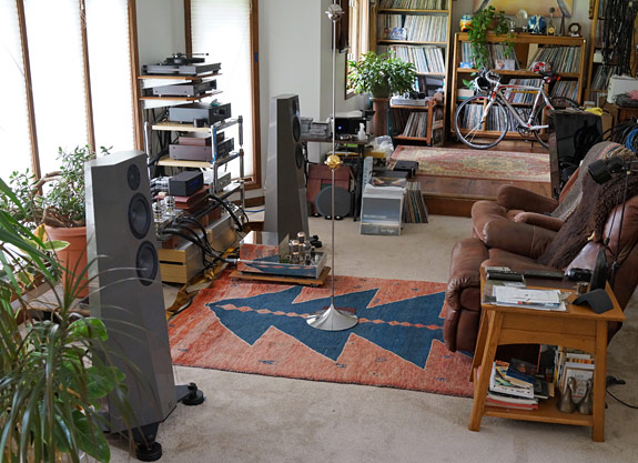 We picked the center divider of the large bay window as the center point on the front wall and from there, Val positioned the speakers equidistant from that point, perfectly aligned, facing straight forward. Then he installed the spike feet and perfectly leveled the speakers, not just to the floor, but to each other. All of this was done with a pair of laser tools and a hand tool to raise or lower the spikes a quarter of a turn at a time. My front wall, it seems, was slightly out of square, and floors are known to bow or not be level whether they are joisted or poured concrete. When Val Cora was done I took another listen and silently whispered "Wow" with my lips. Beyond that, we simply moved the listening chair about a foot closer to the plane of the speakers to get it out of a null point for the bass. Despite all the pinpoint measurements, I never felt obliged to keep my head in a 'vice', though I habitually center myself between the arms of the recliner. The additional damping my room seemed to impose became the new normal. I wasn't about to rip out the carpet and pull the large paintings from my walls.