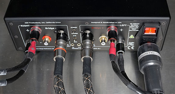 The business side of AGD's Tempo di GaN stereo amplifier is neatly and conveniently laid out with the left and right channel inputs and outputs being mirror images of one another. The power inlet is offset to the right side (when facing it) and thankfully the inlet is a more conventionally designed unit than the original The Audion. (Alberto informed me the new Mk II version of The Audion has a similar simplified AC power inlet module.) This power module has the familiar slide-out fuse holder that will be appreciated by folks who like to upgrade with aftermarket fuses. I've reviewed a hand full of fuses over the years and I'm a big fan of Synergistic Research's Purple fuse, though I haven't yet tried one with the Tempo. Also on the back are two toggle switches — one to select either RCA or XLR inputs, as they are completely separate. The other switches the amp from stereo operation to bridged mono. The right channel RCA input is labeled "bridge – " in white and the left channel RCA input is labeled "bridge +" in red so there is no confusion about how to convert it. Just reconfigure your interconnects and flip the toggle switch and you've got a monoblock amp that puts out 200 Watts into 8 Ohms and 400 Watts into 4 Ohms. Buy two Tempo amps for a stone and a half more than The Audion monoblocks and you sacrifice the intriguing design of The Audion for twice the power. How cool is that? Unfortunately, I only had one review sample so I couldn't try this out.