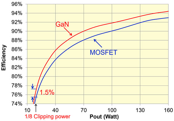 We've all been told that Class D is very efficient and AGD boasts of their 94% efficiency. The chassis becomes only warm to the touch, even at loud playback levels. In fact, the chassis is not even ventilated. There are no slots or holes to provide a flow of air. Additionally, the Tempo is capable of driving mean speaker loads, limited only by the maximum output current of 30A (same as the Audion). But a closer look at power consumption is warranted. Most of the music we play requires only the first few Watts of an amplifier. Class D is a switching topology circuit, and as with all switching circuits, the efficiency is a function of the load, getting up to >95% at higher power and dropping to 75% or less at lower levels. Alberto provided this explanatory diagram to illustrate the concept, in this case comparing Gallium Nitride (GaN) vs. silicon (Si) MOSFETs.