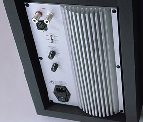 The included 200-watt amplifier powers both 10-inch drivers. Both RCA and XLR preamplification inputs are augmented by loudspeaker inputs for flexibility for any system. The phase is adjustable as is the crossover frequency and volume output (lower knobs). An additional internal circuitry continuously controls the velocity of both drivers' movements. This circuitry promises lower distortions while insuring the loudspeakers are reproducing the proper signal. Another benefit of this design is that the subwoofer system itself is 100dB/W/m sensitive in this 11.8 x 21.7 x 21.7 (WxHxD in inches) enclosure weighing in at approximately 100 lbs.