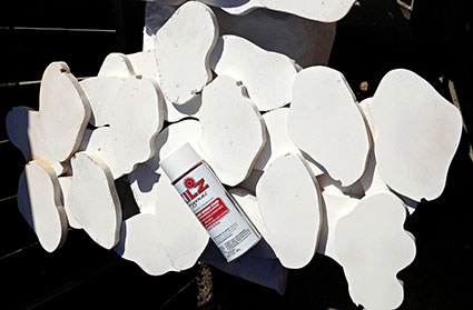 I sanded off the ragged edges as I went, it would have been more efficient to pile them up by the belt sander and do it all at once. The cutouts are 0.75" Baltic birch ply, glued with Titebond II wood glue, and clamped together during glue-up.  This was a tedious process, but there's only so many clamps one fella can use  The nice part is that there's lots of glue area, and it won't be load-bearing, so you don't need to stress TOO much about getting the clamping force right. After the layers are done, a couple rattle-cans of Kilz sealer/primer (Zinsser BIN is similar and also excellent) and some sanding, and we are starting to get close.