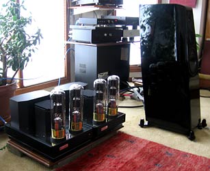 MDF top from an old piece of furniture and under each monoblock, a Symposium Acoustics Isis shelf. Two meter Kharma Matrix Neo 1.0 interconnects reached back to the KR P150 preamplifier Jim had also brought along and eight-foot JPS Labs Superconductor+ speaker cables reached out to the Kharma 2.2 three-way loudspeakers. Jim took the T1610 tubes out of their individually numbered polystyrene foam padded cartons and inserted them in the individually numbered tube sockets. The T1610 tube is about the size of a 1.5 liter wine bottle; the pins are about as thick as pencils. The domed top of the tube filled Jim's hand as he pushed each tube down into its socket. I would have put my bicycling glove on first. I guess it is one of those anxieties in life that goes away after you've performed the task a couple dozen times.