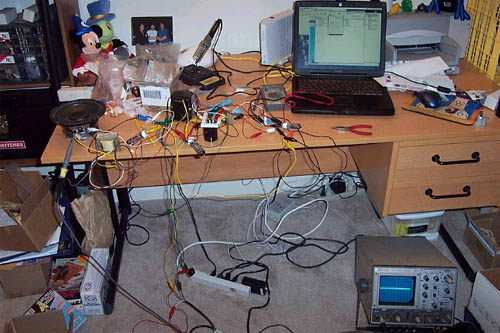 The Real Test I was fully expecting this thing to sound like absolute junk. After all, its clip leaded together, and it was a circuit I just thought up in my head. But boy was I wrong! This 1.5 watt flea powered amplifier sings! Its missing a touch of refinement that my 300B monoblock amplifiers have, but it certainly sounds like a single-ended triode amplifier. And yea, its only 1.5 watts... though my loudspeakers are efficient enough. I found myself groovin' at quite a decent volume with my 97dB horns. It had all those nice qualities like pacing and timing. Qualities I find lacking in some commercial tube amplifiers (perhaps the manufactures want to over-emphasize the 'tube sound' and end up making it sound ooey-gooey?). In fact, this amplifier sounds downright wonderful. This mess of clip leads sounded nice and fast, yet smooth. It will not play extreme loud, but within its useable volume range with is quite nice. Now I just need to find a tube that sounds like this wonderful indirectly heated triode that can give me a few more watts. This is one fun little tube! Now all that's left is to build a chassis for it and do the final construction, and the all important critical listening test. Tune in next month for part 2 to see how this project comes out. Need some "office" speakers to go with this little "office" amplifier? Look for an upcoming article on a matching speaker...