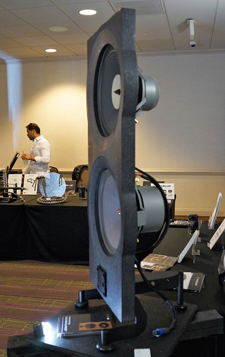 In room 609 a MACARIA with an ash baffle was shown driven by a rig with Geshelli Labs components. Because MACO has a strong relationship with VIABLUE cables from Germany, that was the brand used here. VIABLUE is also the cable used in the crossover and wiring to the drivers. These cables use silver-plated copper conductors. I've used mil-spec silver-plated copper in home-brew cables early on in my audiophile life and found them to be on the brighter side which helps to bring out the treble and improve the resolution. I would expect the VIABLUE with its excellent connectors to be considerably better than my home-brew cable but probably closer to my Synergistic Research cables with pure silver conductors than pure copper cables. When I reviewed the granite speakers at home, I pinched the baffle between my thumb and fore-finger to feel for vibrations. There was none. With the ash baffle, there was a very slight tingle, but it was nowhere as prominent as the baffle on a PureAudioProject speaker I heard elsewhere at the show. Still, the ash baffle was very solid but the music here was not as highly resolved as I had achieved at home. I attribute that to the much less expensive Geshelli components with their wooden chassis.