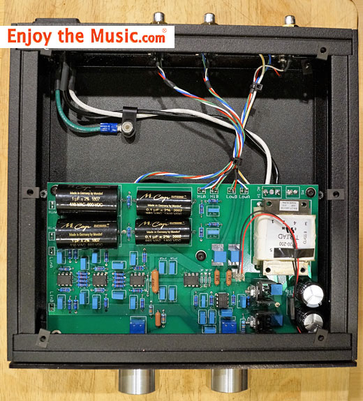Low Frequency Control Center (External Crossover) More tweaks provided equally impressive gains. I not only put a set of Boston Audio TuneBlock footers under the lightweight chassis, but further mass loaded it with a trio of Soundeck Record clamps. The latter kept the heavy power cord from swiveling the unit as well as providing additional damping. I also experimented with a sheet of ERS paper placed beneath the top of the unit which created a greater sense of depth to the soundstage and lowered the noise floor, but also rolled off the top end and over-damped the dynamics. Insertion of a Bybee Technologies iQSE also lowered the noise somewhat but also overdamped the dynamics. This baffled me because I have had such great success with their Quantum Clarifier on my Kharma speakers. Ultimately, I left these later two tweaks out of the equation, preferring transparency and dynamics to a slightly quieter noise floor and greater soundstage depth. I would have loved to try the Quantum Clarifiers on the four 18" Peavy drivers in the bass cubes, but I wasn't about to pull them out of my Kharma speakers. For the range below 100Hz the Low Frequency Control Center is equipped with a volume control that was sensitive to even slight adjustments with very little movement of the dial. An adjacent knob controlled the contour of the bass response, raising the volume in the 20Hz-30Hz range to compensate for bi-polar cancellation in the low bass that sometimes occurs due to speaker placement. But as I said, I had very little measured response below about 35Hz. John Marks' Pipes Rhode Island revealed organ notes that low at a very solid and enjoyable level. Essentially, the Low Frequency Control Center is a tone control for the bass. Inside, the unit was simply laid out with most of the footprint taken up by a printed circuit board loaded with M Caps and tiny components.