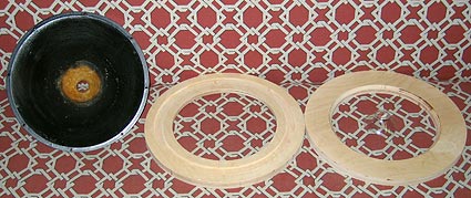 First we see the Parts Express 12" waveguides with an "inset throat". I had started with these as a rough experimental device, but they left a problematic lip at the driver/waveguide junction. I looked for something that would allow me to fill the gap and create a rounded profile, transitioning into the horn. I wound up cutting out a section of the top of a two litre bottle (shown). By using putty and compressing it with this, I got the desired throat diameter, as well as a rounded transition into the rest of the horn. A straight edge was used to form the putty to a straight-wall profile following the throat roundover, creating a rough approximation of the OS profile (but with a longer, softer mouth taper and less precision). It is critical to match the diameter of your waveguide's throat to that of the compression driver, as well as the angle (the tube on the compression driver has an expansion characteristic of its own). I inspected the waveguide, ran some impedance sweeps, and decided to go further with it. I machined a ring for the mounting lip of the waveguide to screw to, with a 45 degree edge on the internal cutout. You can see that there's a ledge routered in as this was necessary to ensure proper centering. Once this was mounted, I began filling it in to create the conical section, as defined by the lip. I tried multiple fillers. The best was a two-part body epoxy paste designed to work alone (doesn't need cloth or a form, you could model with it if it weren't epoxy), but was expensive. All epoxy-based products worked to one extent or another (wood filler with epoxy was the best from an economics vs. performance standpoint).