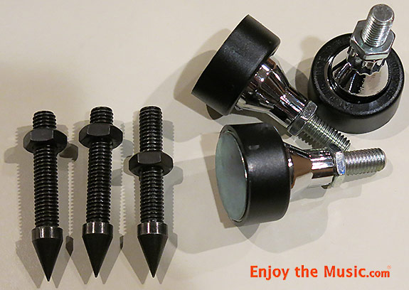 The speakers were supplied with feet that swiveled and had a smooth flat surface to protect a hardwood floor, but on seeing photos of my room with broadloom carpeting, Ze'ev rushed me a set of pointed spikes which pierced the carpet and improved the sound considerably. Even greater improvement was achieved by placing SoundDampedSteel IsoFeet squares under the spikes as I normally do. Eventually, due to the mid-field listening distance and the perceived need to raise the speaker higher in addition to tilting them back, I used 2.25" (~6cm) thick slabs of architectural slate to raise them. A 3" or 4" lift might have been even better in my case, though this will depend upon your listening distance and the height of your ear in your favorite chair. The result was certainly worth the effort at the time and the expense is minimal, depending on the material you select. The grey slate blended nicely with the smoked oak finish.