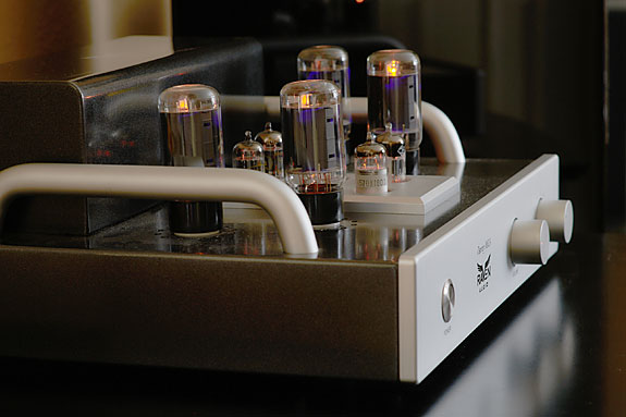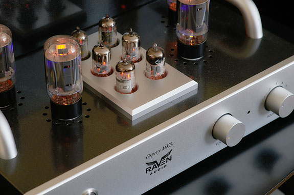 The pair I reviewed were finished in a flat black, which looked great. The Osprey Mk3 integrated amp is a 30 WPC tube amp that uses four 12AT7 and two 12AU7 small-signal tubes and four 6L6GC pentodes on the output stage. The Osprey has five inputs and an RCA output for a sub. Five inputs are a luxury for an amplifier in this price range since high-quality five-way selector switches are costly. A remote control for volume is also provided. The Osprey MK3 is beautifully finished in silver and black. This integrated amp looks and feels like a high-quality product.