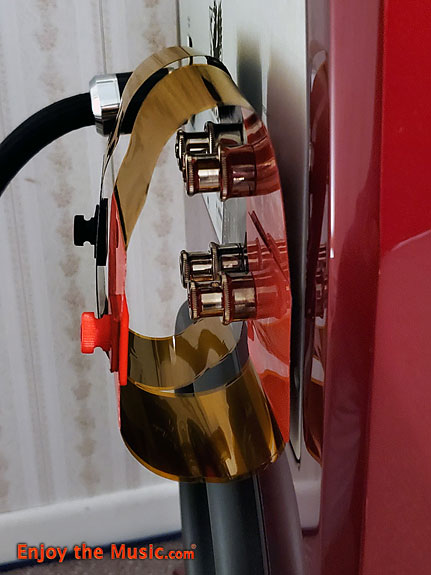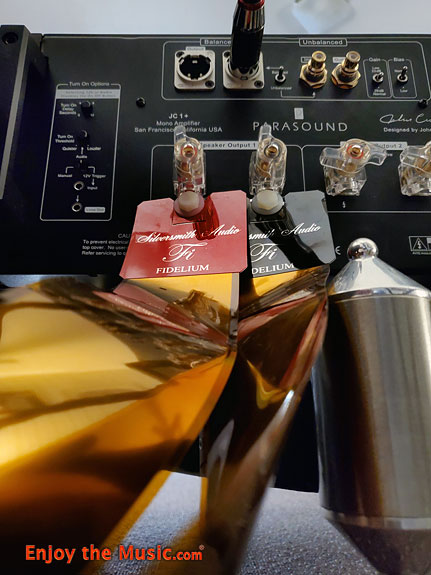 As soon as the Fidelium jumpers arrived, I pounced on their installation. I was intrigued; these jumpers are unique in that they are a pair of single ribbons, about a foot each in length, with a notch and the applied termination labels on each end. But they have another "termination" at the midpoint of their short running length. This one faces off to the side of the ribbon and includes a nylon threaded clamping adapter. You mount the separate polarity ribbons, in the shape of a C, between upper and lower binding post, with the bare termination connection side of the notched ribbon section against the speaker side of the post. So, you connect it extending upward from the top set of binding posts, then let it curl downward past the bottom set of binding posts, where you turn that other termination back up and connect it from below the lower binding posts. From the side, it looks like a C. Once that C connection is made, you attach the respective positive or negative ribbon coming from the amplifier speaker outputs to that central termination and clamp it down with the nylon adaptor. See the included photos. So, not only is this utter simplistic genius, the result is monumentally effective. Such a connection actually terminates the single ribbons at both sets of speaker dual binding posts at once rather than connecting to one set, and then "jumping" to the other, eliminating the involvement of the first set of binding posts. Did I mention Jeff was a clever cat? So, once these ingenious connectors (I'm loath to call them jumpers, after all) were installed, and the now fully conditioned Fidelium cables were reattached, I fired up the system and - my jaw dropped! At this point, there simply was no doubt that my $18,000 flagship set of cables, cables that had reigned unbeaten by any and all challengers within my current system for the past six years, were for the first time seemingly being bested. I say seemingly because it was difficult for me to admit. Part of me, a specific slice of my persona, the prideful owner of these flagship loudspeaker cables, took over. That dogmatic voice was saying to me, "This has to be a mistake, switch them back and you'll see." And so, over the next two-and-a-half weeks, with something like fifty more swaps back and forth between my reference cables and the Fidelium's, the music lover in me finally took control and sent the prideful persona packing. It was about the tenth time that the music lover persona's voice said, "How many more times are you going to swap these cables, only to hear the same results, before you just admit that you have a new reference cable on your hands? What will it take to get you past that stigma and admit to yourself, and your readers, that this is a game-changing product?" that it sunk in.