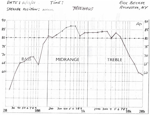 After listening for a week with only moderate enthusiasm for the speaker I pulled out my Radio Shack SPL meter. I simply wasn't getting the quality of music I heard at the show. The 160Hz to 6kHz shown on the chart was actually pretty good for a crude in-room measurement for a system that has not been digitally corrected. But while the bass sounded tight, it was weak in volume and likewise, the treble was prematurely rolled off. Rich informed me that bumping up the voltage to the full-range driver will raise the treble a bit, but I felt like I needed more than just a slight boost so I turned my attention to the super-tweeter attenuator. I bumped it up two notches at a time until I reached the top. It was a bit bright, so I backed it down a notch. While these frequencies are far above what I can recognize as test tones in a typical hearing test, the sense of air and spaciousness it brought to the music was undeniable. This was not the first time I've had this experience with a super-tweeter. Rich was likewise dismayed with the setting on the MiniDSP, so he sent a second unit, pre-programed with four different crossover points and boosts to the bass, all selectable with the push of a button on the included Apple remote. The remote also allowed adjustable volume for each of the settings. For my convenience he labeled the inputs and outputs of the MiniDSP on tape, as seen in the photo far above. A more computer savvy owner can download the MiniDSP app onto a tablet or laptop, and with the help of a microphone program the room corrections into the MiniDSP, as well as tweak the settings as they listen to music from their chair. There are 10 filter positions, each of which can apply a variety of parametric EQ functions and be set at any frequency. Rich had done this when he delivered the speaker, but once I had reviewed some familiar music it became obvious that further tweaking was needed. With the new MiniDSP installed and Apple remote in hand, it was relatively easy to run through the preset bass profiles Rich had supplied to find the one that worked the best. Trying to learn how to program the MiniDSP would have put this review out another month, given my aptitude for computers, but it is easy to understand that a very smooth bass response is achievable (with the exception of a suck-out caused by room node cancelations.) Here's what the SPL chart looked like after the tweaking with the changes marked in red. Again, this is just a crude Radio Shack meter result.