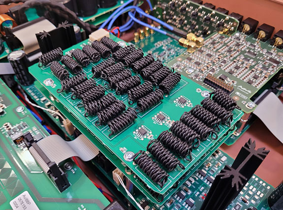 According to the information at their site, both coils carry voltage, and when one of the Tesla coils encounters a voltage spike, a counter spike is activated to eliminate the noise. Since noise spikes are pure voltage carrying virtually no charge, even though the resultant cancellation is quite good, it alone is not perfect. The addition of many Tesla coils in parallel increases their effective noise cancellation, elevating the degree of the perceived blackness from which all the music emanates, and significantly increasing the overall purity and clarity of the sound. A closer look reveals that AGD uses several different types of these Tesla coils, as their individual properties ideally complement and reinforce one another. There is the passive Tesla Coil Technology (P-TC), used in a noise suppressing role that focuses on mains power spike noise cancellation and works by having their double inverted coils connected to the power conductors.