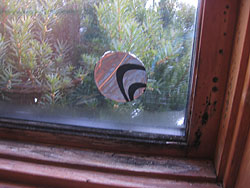 Ron Hedrick suggested that I needed to treat all six windows for optimum benefit. I positioned a circle of Dynamat in each corner, about two inches from each edge as illustrated on the Marigo Labs website. I peeled the waxed paper off the black sticky side and carefully oriented the circles so the printed abstract designs that were part of the Dynamat labeling created a quasi-Zen-like artistic symbol. Hey, sometimes you have to work with what you've got. Plan B is to paint them to match the walls. The black tacky material sticks tenaciously to the glass and is hardly noticeable from the outside of the house unless you're looking for it. If necessary, the circles can be removed with a razor blade and any slight residue should come off with a solvent such as the bug and tar remover you use on your car.